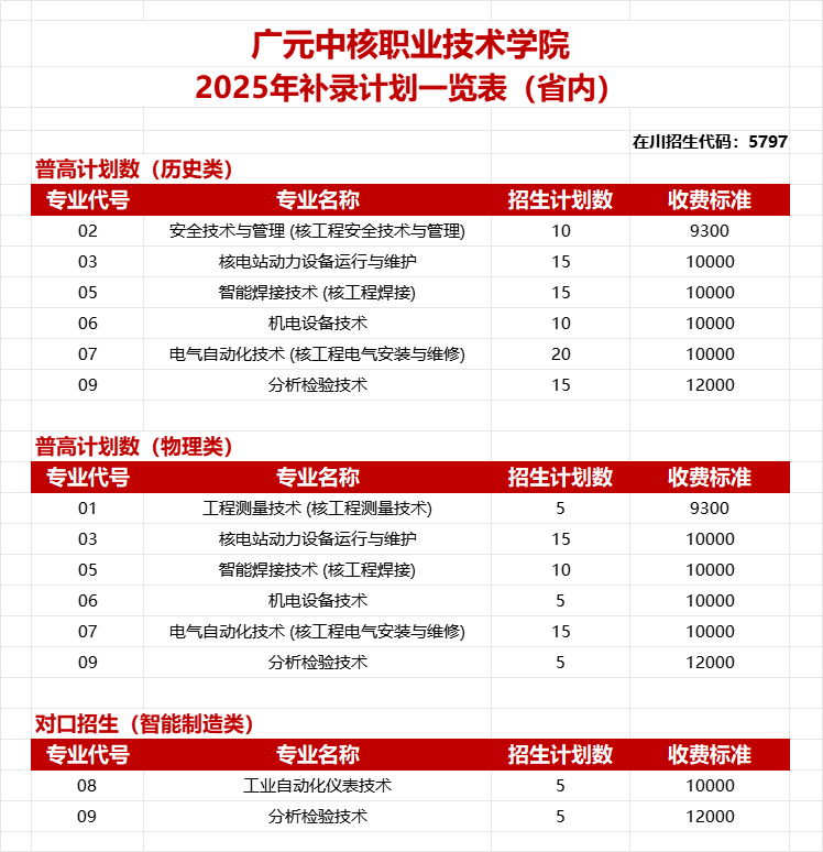 - 2025-09-18 广元中核职业技术学院2025年专科补录计划和专业
