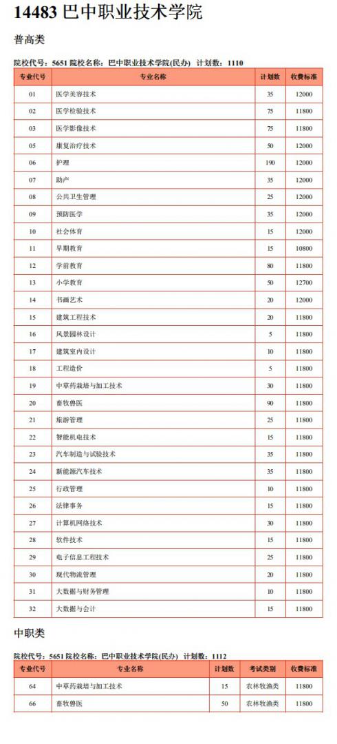 - 2023-06-05 巴中职业技术学院2023年高职单招招生计划与历年分数线