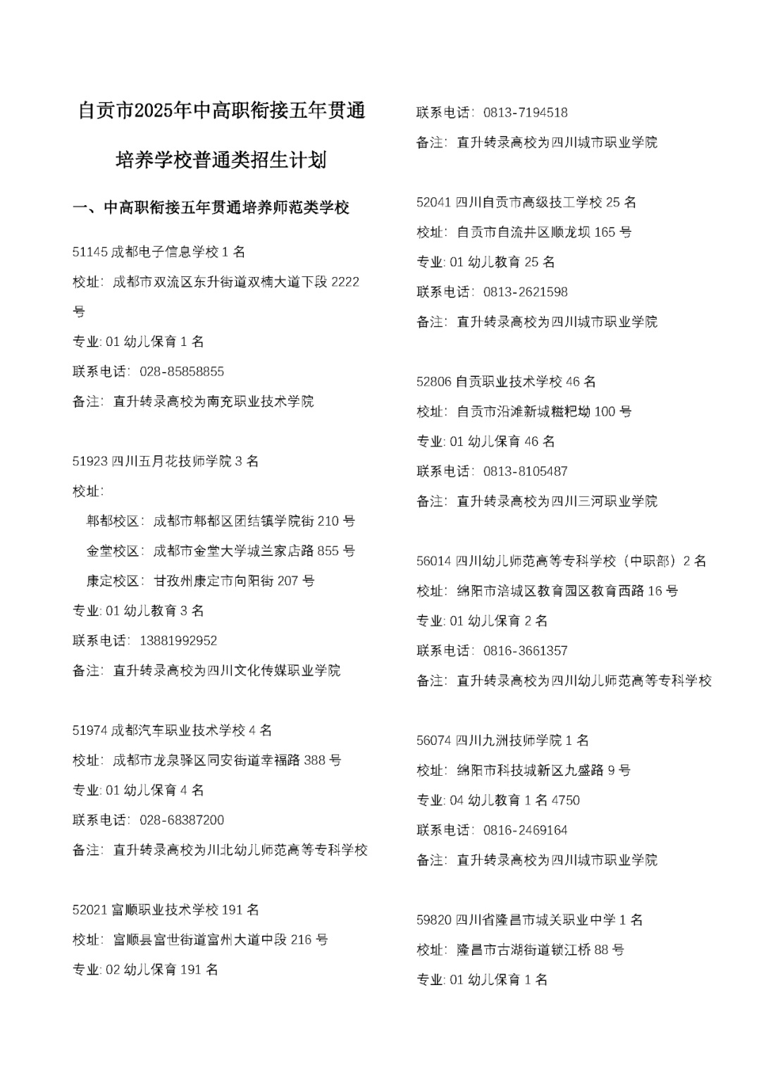 - 2025-09-18 自贡市2025年中高职衔接五年贯通培养学校普通类招生计划
