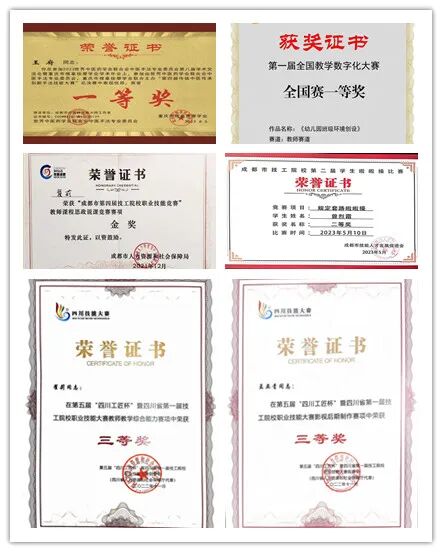 在各项大赛中,学校先后荣获了四川省第一届技能院校职业技能大赛三等奖、成都市第四届技工院校职业技能竞赛中荣获金、银、铜奖及“优秀组织奖”、成都市中等职业学校学前教育专业产教融合实践师生技能大赛——组织奖、郫都区二星级“两新”党组等多项殊荣,为地方经济社会发展和企业转型升级做出了重要贡献。