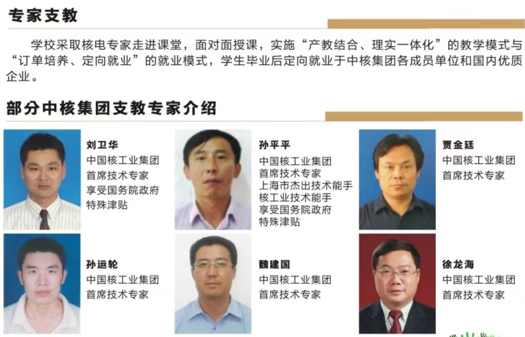 学校依托核工业优势资源,传承“两弹一星”精神和“四个一切”核工业精神,践行“强核强国 创新奉献”的新时代核工业精神;以为核工业产业队伍人才需求与地方经济发展培养德智体美劳全面发展的高素质技术技能型人才为己任,学生毕业后可选择升入我校高职或其它高职院校继续深造,也可就业于中国核工业集团有限公司下属各成员单位和全国知名企业。学校先后为国家核电建设与地方产业培养了10万余名高技术技能人才,其中获“大国工匠”“全国技术能手”“全国劳动模范”“五一劳动奖章”30余人,自主创业资产过亿5人,学校80%毕业学生均成为国家核电建设的骨干力量。