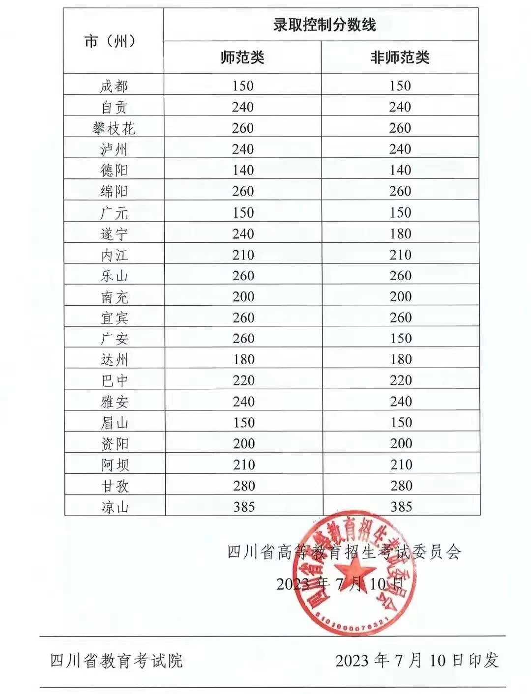 四川省2023年中高职衔接五年贯通培养录取控制分数线