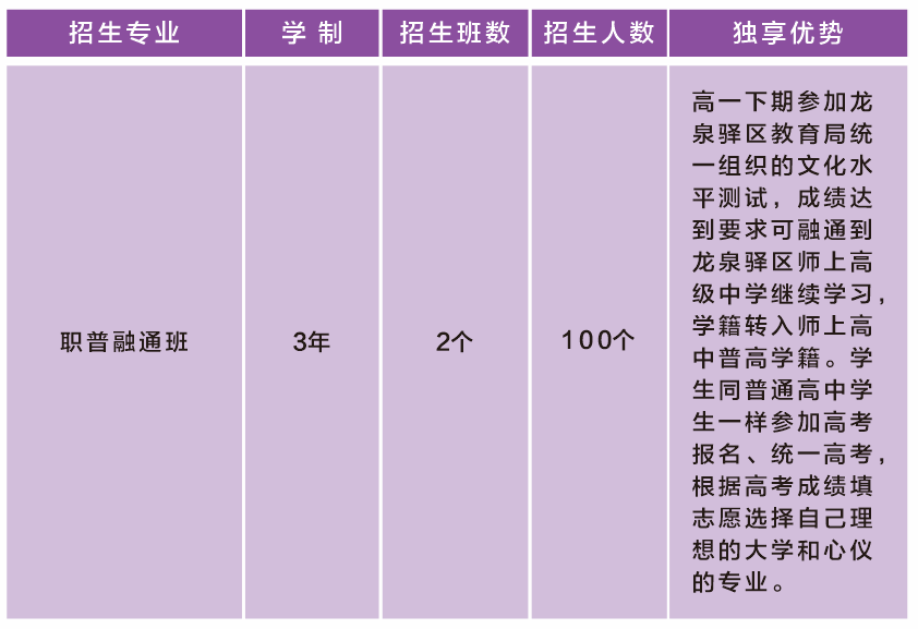职普融通班招生按照龙泉驿区教育局要求实行自主招生,学生可凭诊断考试成绩或中考成绩提前到校参观预报名或中考成绩出来后现场报名,我校招办统一收集报读学生信息上报龙泉驿区教育局统一录取。名额有限,报满为止。