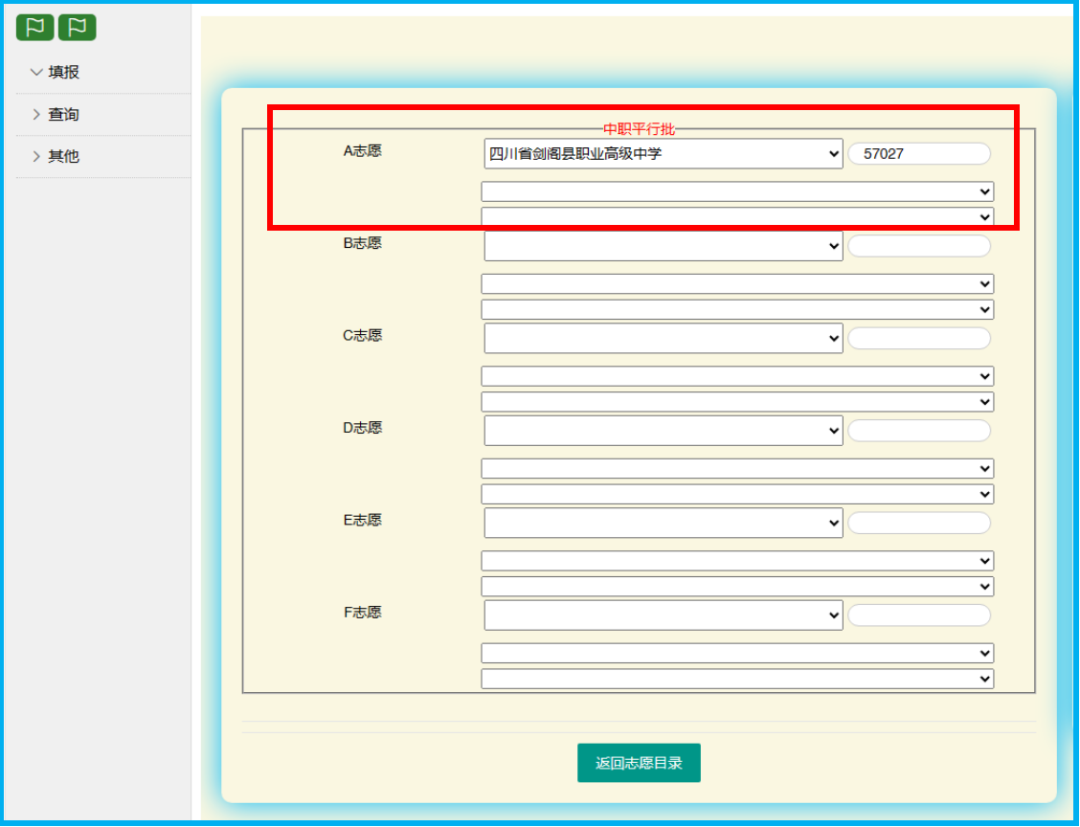 打开“中职平行批”,填写志愿,A、B两个志愿必填,A志愿选“四川省剑阁职业高级中学校”,B志愿根据意愿任选,每个学校均可填写2个专业志愿,必填1个。