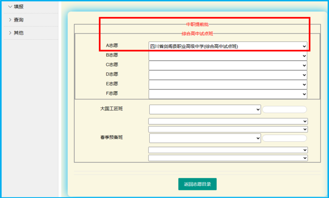 点击“高中志愿”在中职提前批综合高中试点班A志愿中选择“四川省剑阁职业高级中学校(综合高中试点班)”。