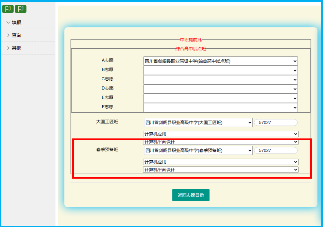 “春季预备班”共1个学校志愿,选择“四川省剑阁职业高级中学校(春季预备班)”;可同时填报2个专业志愿,必填1个。