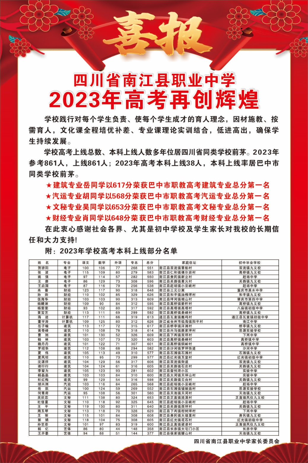 四川省南江县职业中学是南江县人民政府举办的,集学历教育和社会培训、技能鉴定于一体的公办中等职业学校。学校秉承“立于礼,精于技”的育人理念,坚持“传承文明,服务发展,追求卓越”的办学思想,现为四川省重点中等职业学校、四川省示范中等职业学校。曾先后被授予“四川省校风示范学校”“四川省青少年科技教育示范学校”“四川省依法治校示范学校”“全国青少年普法教育先进单位”等荣誉称号。2022年被列为四川省中等职业教育“三名工程”(三星级)项目建设学校,2024年5月,经巴中市教育局批准,我校被确定为综合高中(普高班)试点学校。