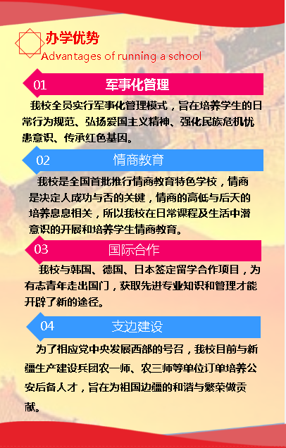 学校实行全军事化管理,旨在培养学生的日常行为规范,弘扬爱国主义精神,强化民族忧患意识,增强民族凝聚力,我校拥有雄厚的师资力量,完善的教学设施设备及国防教育训练展示器材,丰富多样的军警训练设备,是川东北地区唯一的国防教育科普基地,也是全国首个开展情商教育的试点学校,让学生面对社会、面对人生形成独立的完美的健康的品质和崇高的情操。