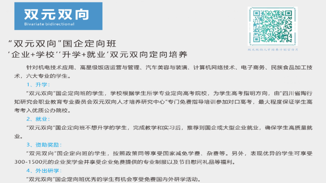 学校始终坚持以学生为中心的办学理念,探索“学技术有门路,读中职有出路、就业升学两不误”的学生多渠道成才道路。创新院校合作、深度校企合作、产教融合、东西部协作人才培养模式,全方位地进行职业教育教学改革与创新,让每一个学生享受到优质教育资源,让每一位学生都能体验到职业教育成才的喜悦,让每一位学生都能出彩人生。
