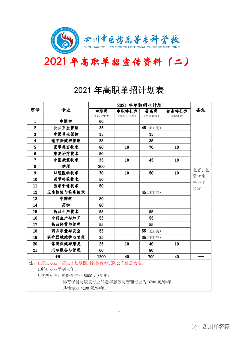 二、四川中医药高等专科学校2021年单招专业及单招计划: