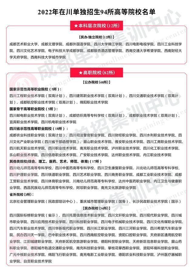 2022年在川单独招生94所高等院校名单