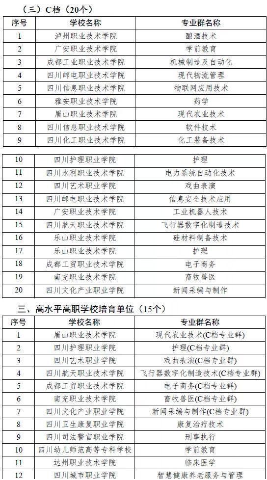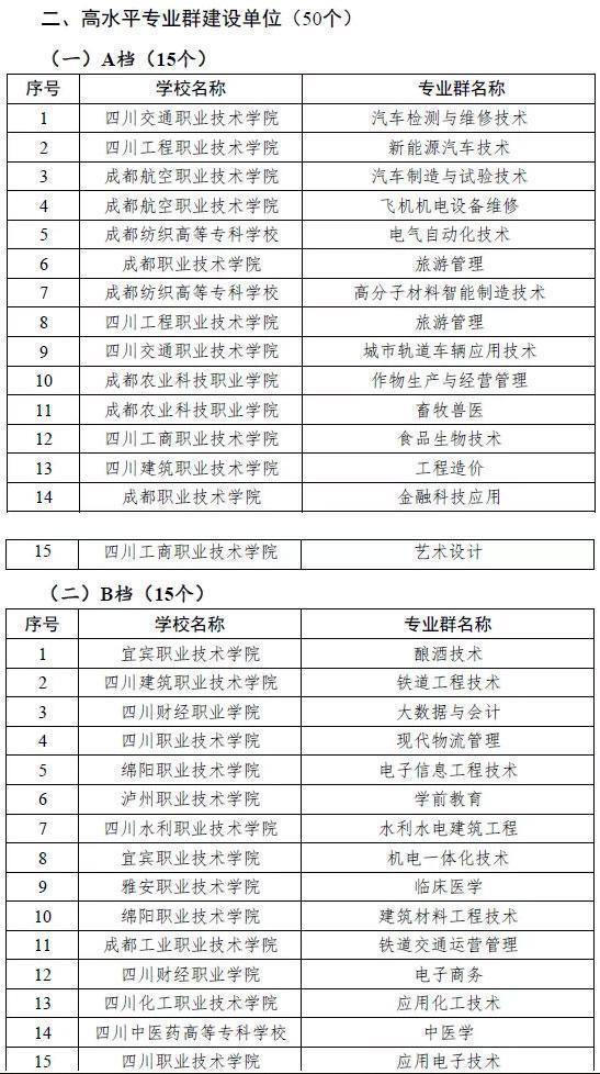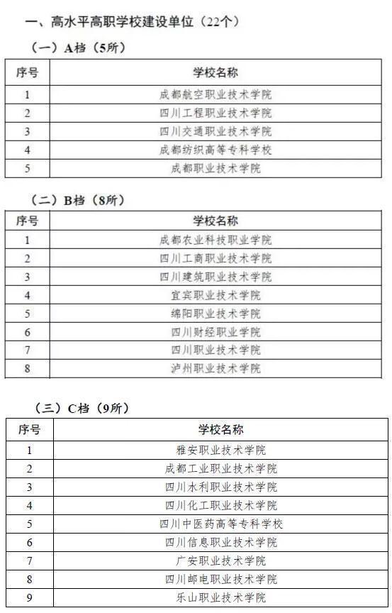 四川省立项建设的22所高水平高等职业学校(含8所“国家双高”建设学校),50所高水平专业群,15所高水平高等职业培育学校正式确定,并进入编制项目建设任务书环节。根据学校办学水平和建设方案分类分档立项建设,高水平高职学校、高水平专业群建设单位都分为了A、B、C三档。