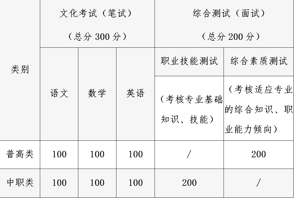 文化考试试题由省统一命制,分普高类、中职类,语文、数学、英语三科同堂分卷,每科分值100分,总分300分;综合测试分值200分。