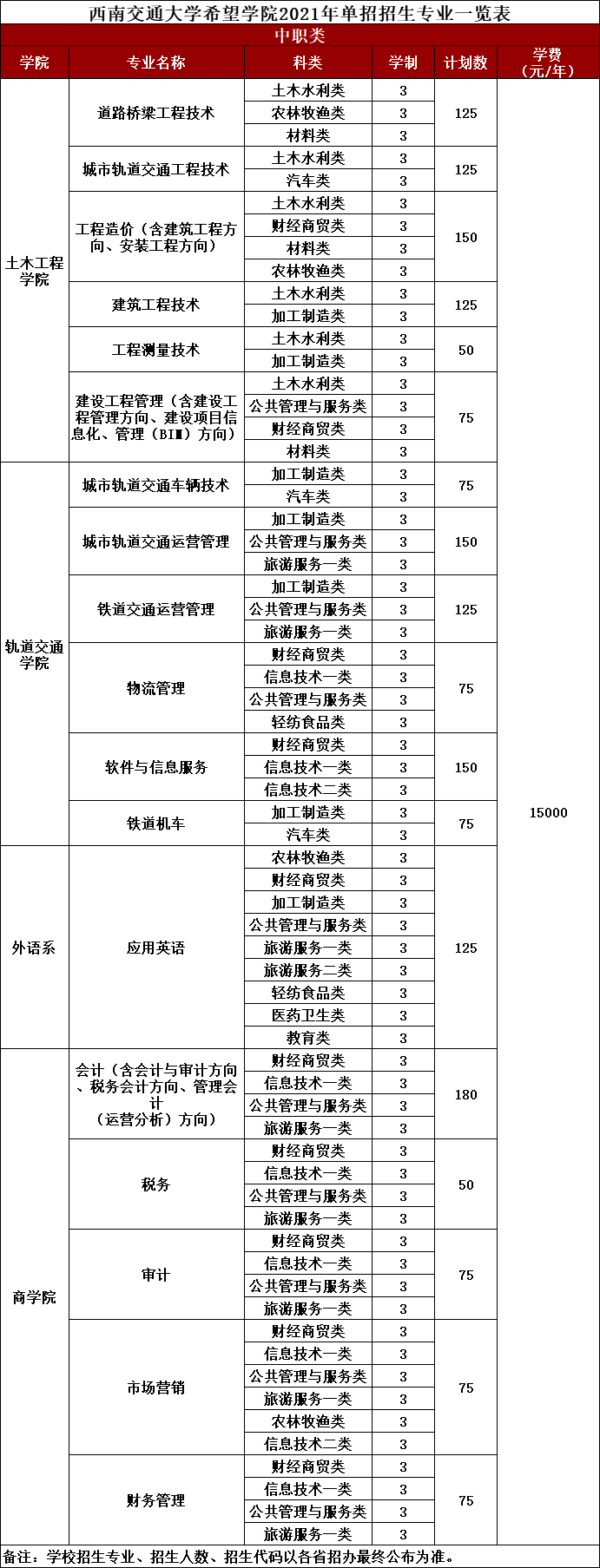 - 2021-09-13 西南交通大学希望学院2021年单招专业