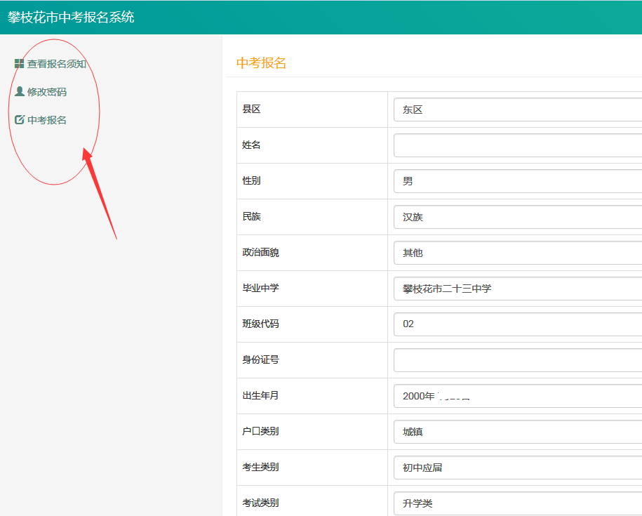 4、 考生可通过点击页面左端的“查看报名须知”、“修改密码”、“中考报名”等选项,执行相应的功能。