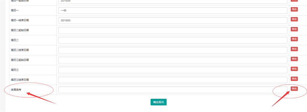 3、 进入报名系统后,考生可检查自己各项报名信息是否正确;通过点击“修改”按钮,可对联系电话、通信地址、邮政编码、简历、体育选考项目等信息项进行填报和修改;对于其他不能修改的信息项,如果确实有误,可向指导老师提出修改申请。
