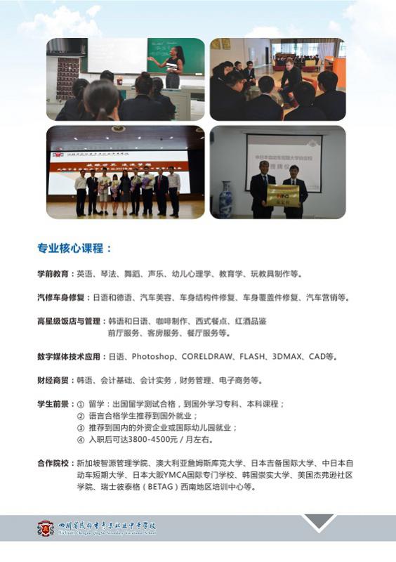 学校在成都市中职学校中率先开办国际教育,与新加坡智源管理学院、美国肯塔基州路易维尔友城杰弗逊社区学院、澳洲詹姆斯库克大学(新加坡校区)、日本吉备国际大学、中日本汽车学院等国际院校开展了多种形式的联合办学。还与一批国际国内知名企业、院校开展广泛合作,为学生发展构建就业?升学?留学?创业的成才立交桥。