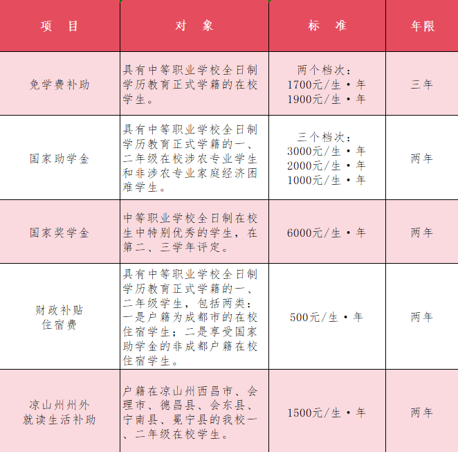 2024级新生,可以不交一分钱的学费!本来,根据成都市发展和改革委员会〔2012〕317号、大邑县发展和改革局〔2016〕8号文件,学校的学费标准为:文史类专业4150元/生·年,理工类专业4250元/生·年。中职学制三年,合计应交学费就是:文史类专业12450元、理工类专业12750元。