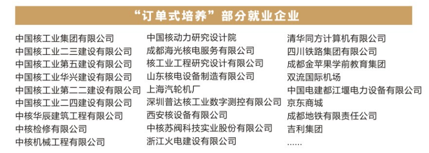 学校与国内外100余家知名企业建立了“订单式”培养模式,采用技术专家驻校模式,教学与专业培训处于“岗位零距离”状态,毕业生供不应求,就业水平始居全国一流。随着我国核工业产业快速发展,学校作为中国核工业技能人才定点培训基地,承担了数万名中高级人才培养的光荣任务,将为千万学子铺筑实现人生理想的广阔空间。