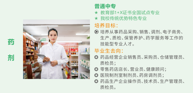 专业设置紧紧围绕医药行业和大健康产业。现国家高度重视大健康产业和中医药事业发展,专业人才紧缺,药校学子未来可期。