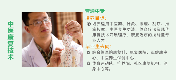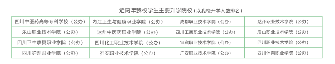 可通过五年制高职大专、单招考试、对口高考升入本专科院校就读,可对口升入四川中医药高等专科学校、乐山职业技术学院、四川护理学院、达州中医药职业学院等高等院校。