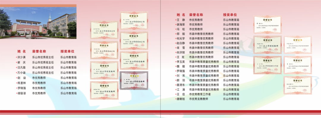 学校师资力量雄厚。现有正高级教师4人,特级教师2人,高级教师139人,一级教师158人,获国家、省市其他荣誉称号者150余人。教师赛课获全国高中学科一等奖2人、二等奖1人;获得省赛课特等奖2人,省高中学科优质课展评一等奖9人、二等奖6人,省微课大赛41人获奖;获得乐山市学科展评课一等奖23人。