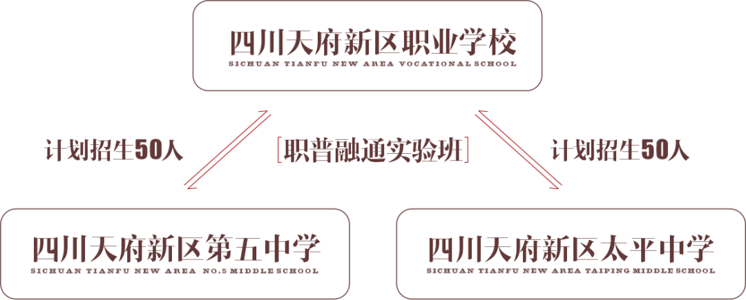 2021年秋季起,四川天府新区职业学校与四川天府新区第五中学、四川天府新区太平中学各联合举办1个“职普融通实验班”,每班50人,两个班级共计划招生100人。列入天府职校招生计划,注册中职学籍,由天府职校统一管理。