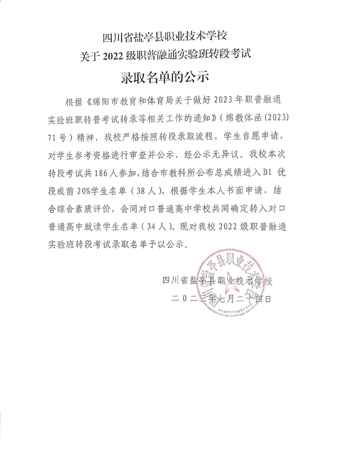根据《绵阳市教育和体育局关于推动普职融通育人模式改革的实施意见》,2021年起,盐亭县职业技术学校与盐亭中学联合举办职普融通教育实验班。