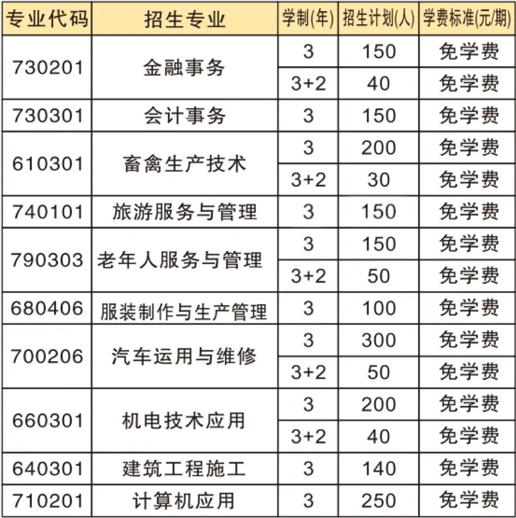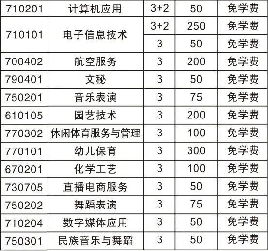 备注:就读“3+2”的学生,前3年中职免学费,后2年按对应高职院校标准收费。