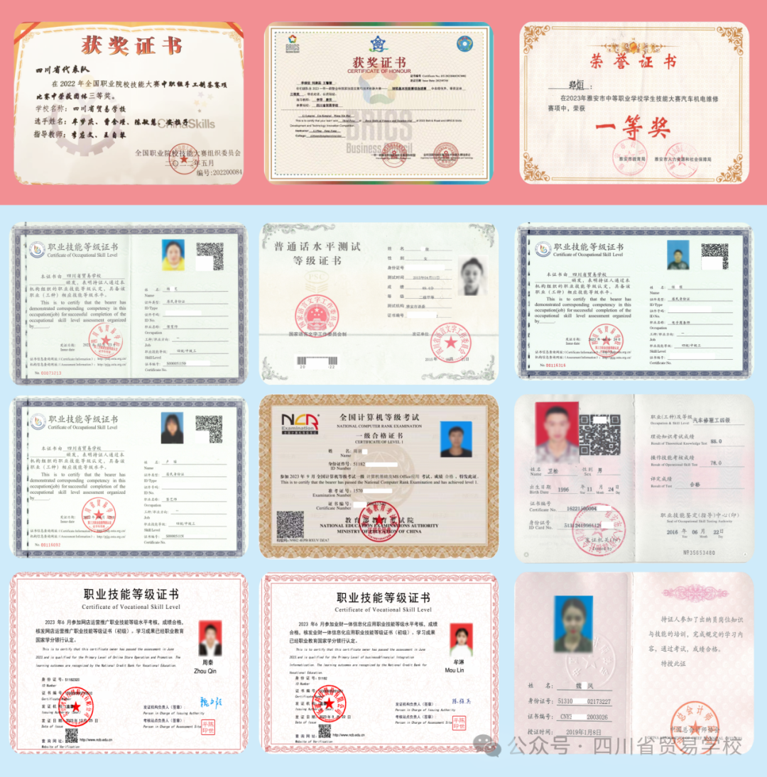 学校是四川省第三方技能等级认定中心,学生在校就读期间年满16周岁,可考取保育师、育婴员、汽车维修工、汽车车身整形修复工、电子商务师、茶叶生产与加工、评茶员和茶艺师等职业资格证书。