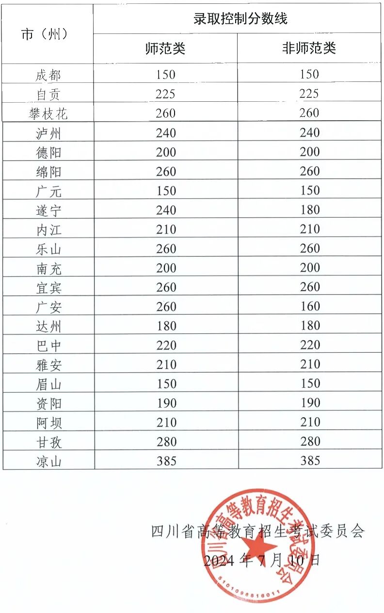 四川省高等教育招生考试委员会在7月中旬会公布今年的五年制大专录取控制分数线,在此之前可参考2024年各地市州录取分数线进行志愿填报,我校五年制大专专业均属非师范类。