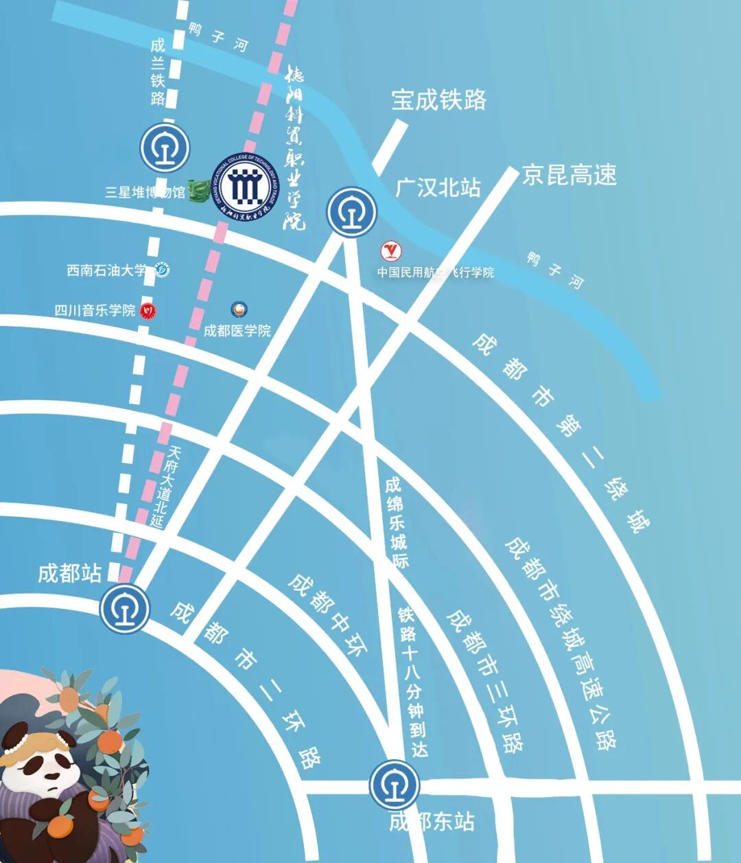 我校位于德阳高职教改综合实验区广汉市三星堆大道东段122号。与“三星堆”作邻,感受古蜀文明,传承千年历史。学院距广汉高铁站驾车约7分钟。从广汉北站乘坐高铁18分钟即可直达成都市东站。学院处成都半小时经济圈内,有两条高速围绕(京昆高速和成都第二绕城高速)。其距市中心车程5分钟。地理位置优越,交通便捷,生活便利。