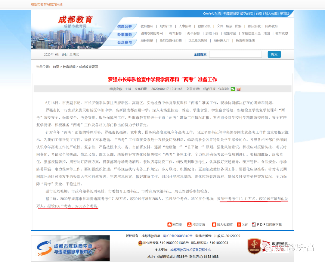 6月17日,成都市教育局通过官方网站公布了今年成都中考考生、考点等相关数据: